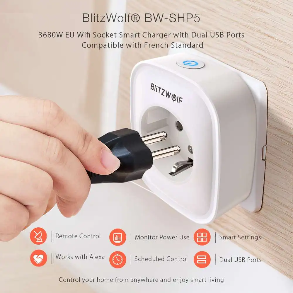 Best . (40% Off) Buy In Stock BlitzWolf BW SHP5 2.1A Dual USB Ports 16A Smart WIFI Socket EU Plug Work with Alexa Google Assistant BlitzWolf Tuya APP Price Online.