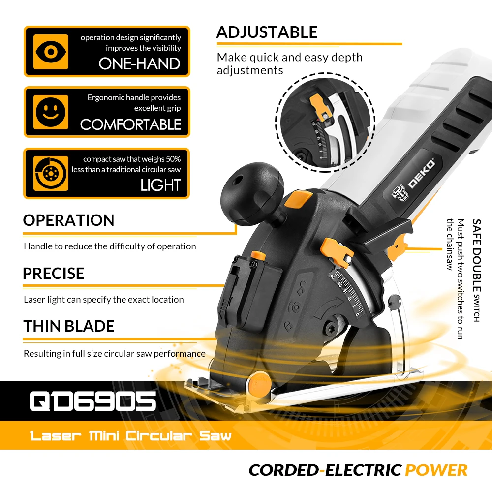 Special Offer DEKO QD6905 Mini Electric Circular Saw Power Tool with Laser Guide, 4 Blades, Dust Passage, Allen Key, Auxiliary Handle, BMC Box Discount 37% Today!