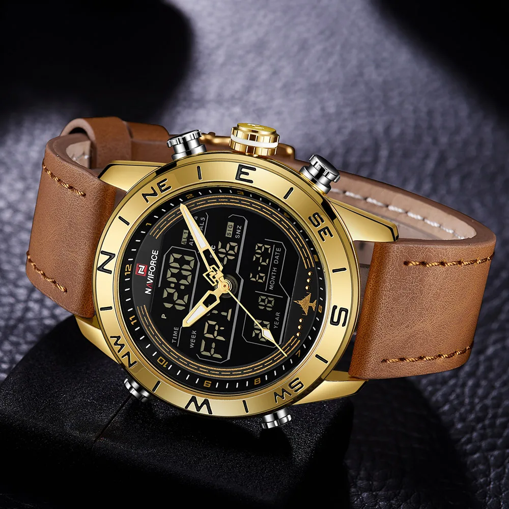 Special Offer NAVIFORCE 9144 Fashion Gold Men Sport Watches Mens LED Analog Digital Watch Army Military Leather Quartz Watch Relogio Masculino Discount 58% Today!