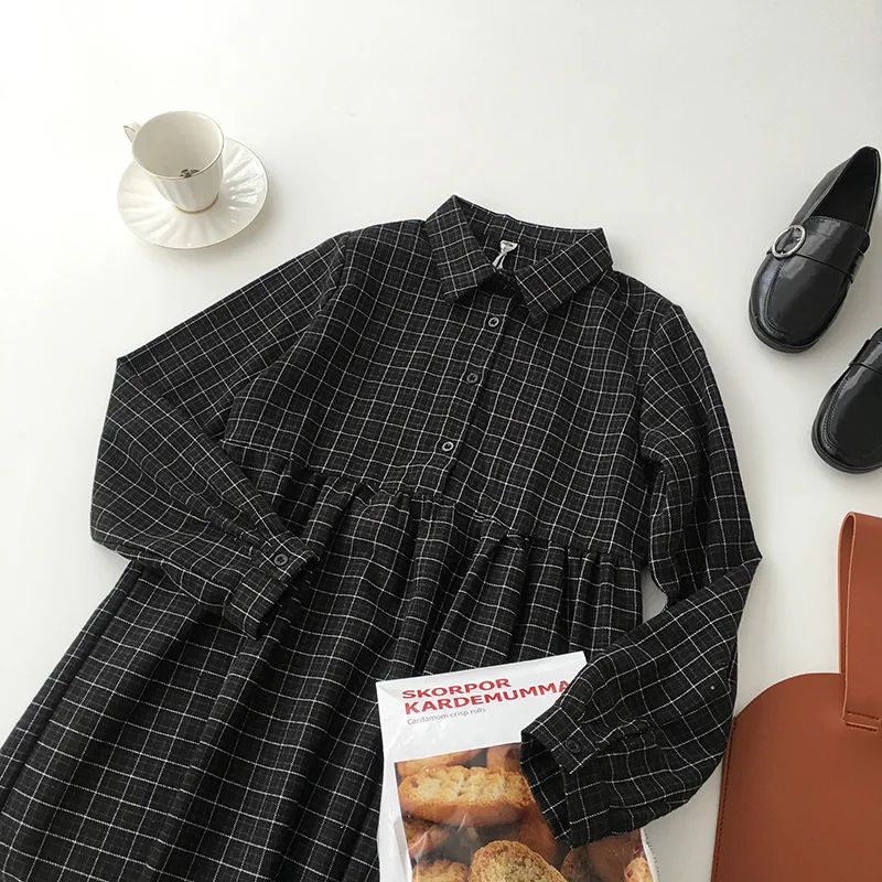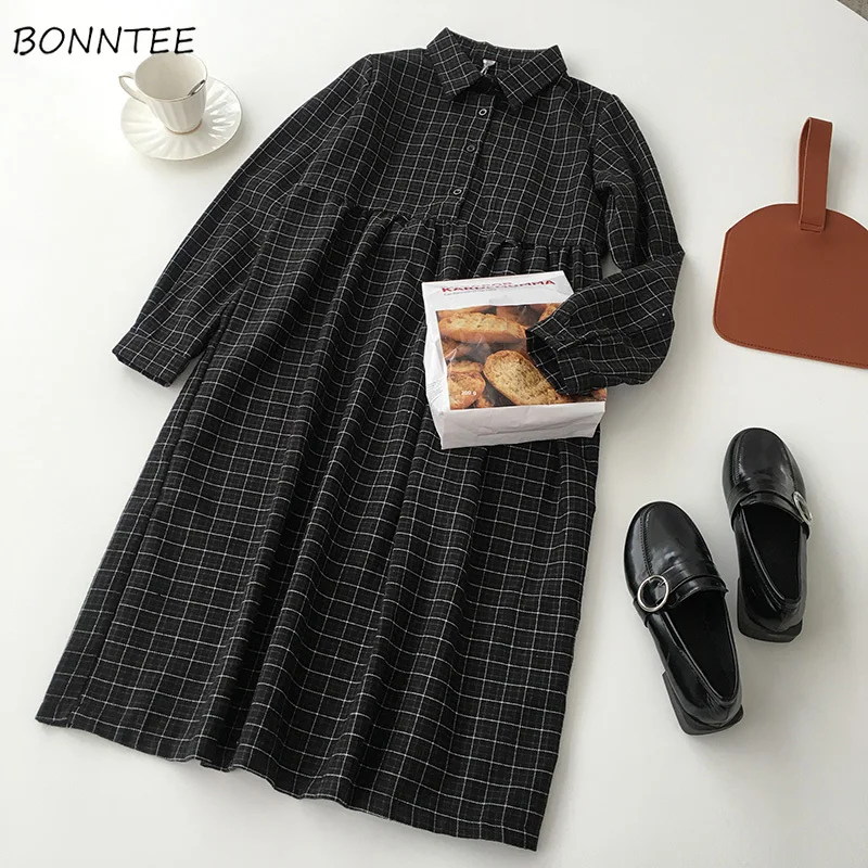 Special Offer Dress Women Casual A Line High quality High Waist Button Plaid Soft All match Spring Korean Style Comfortable Long Sleeve Lovely Discount 5% Today!