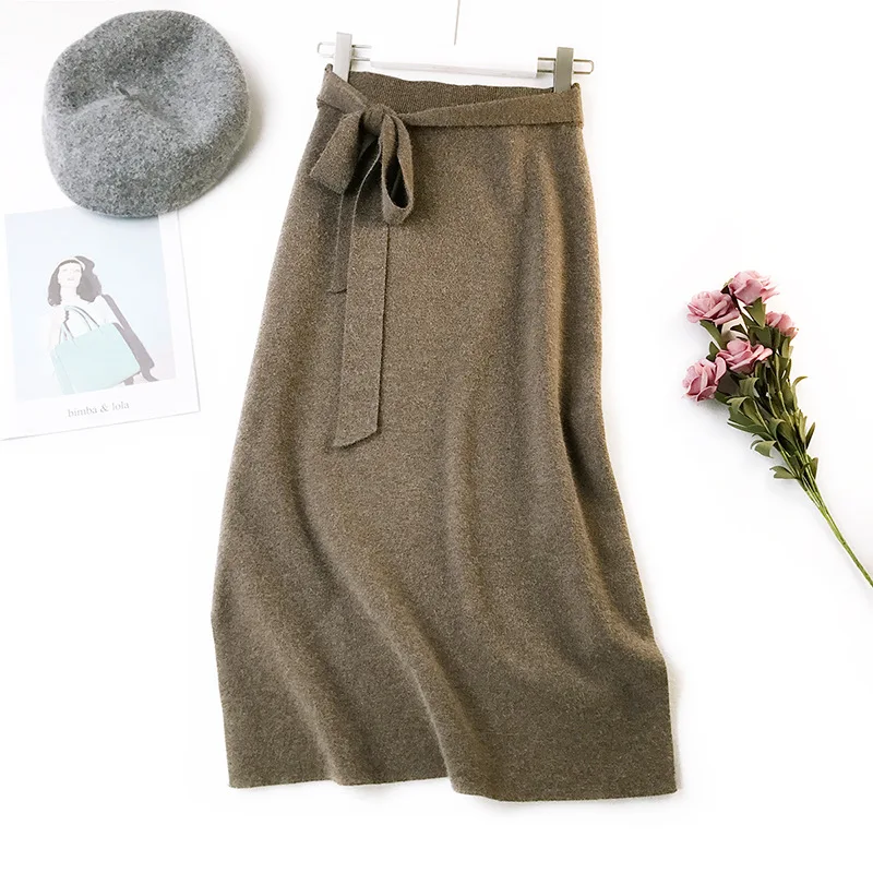 Special Offer Autumn Winter Women Midi Long Sweater Skirt Elastic High Waist Tie Bow Knitted Skirts Female All Match Split A Line Skirt AB1271 Discount 49% Today!