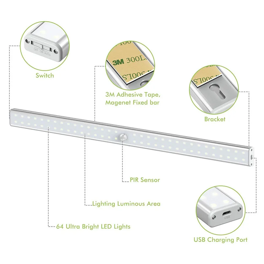 Best . (35% Off) Buy 20 36 64LEDs USB Rechargeable LED Under Cabinet Light PIR Motion Sensor Cabinet Closet Night Light for Wardrobe Cupboard Kitchen Price Online.