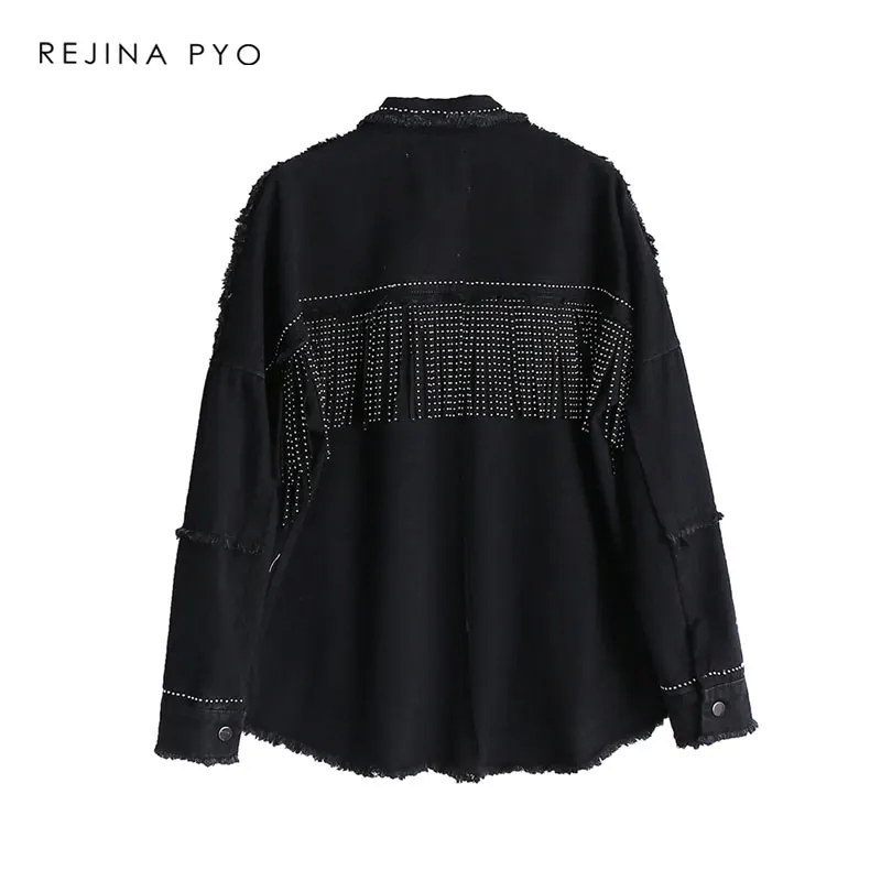 Special Offer REJINAPYO Women Black High Quality Loose Denim Jacket Coat Sequined Tassels Streetwear All match Mental Covered Button Outerwear Discount 58% Today!